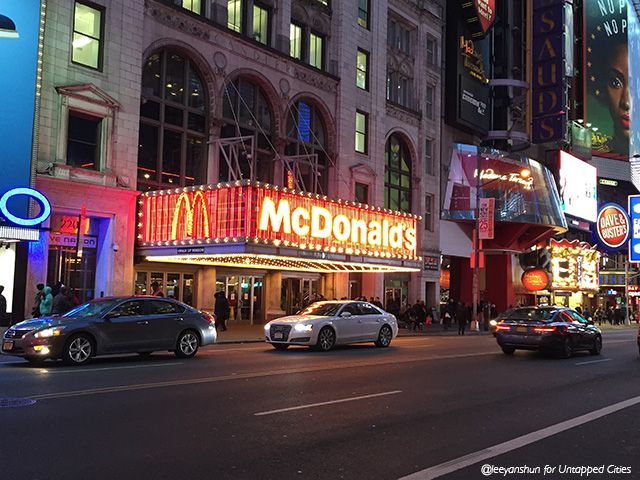 Not all McDonald’s are created equal. Most are in fact quite pedestrian, with the easily recognizable “M” set in on a wooden grating. If the Golden Arches has a New York flagship store, the one on 42nd Street would be it. The full length theater marquee with a total of 7,500 light bulbs running along all sides harken back to the era of the Harris Theater– a state-of-the-art picture palace designed in the Italian Renaissance style. Blasting music greets patrons as they order from a counter that looks more like a box office than a fast food chain.