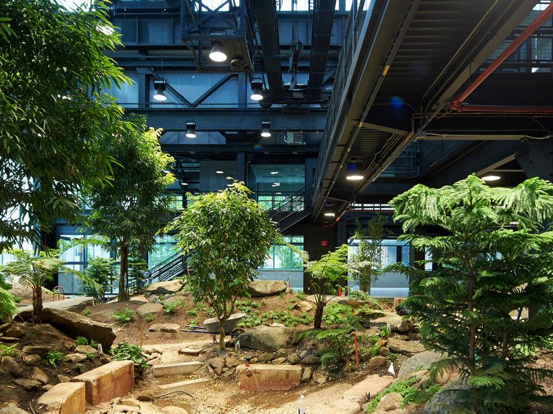The adaptive re-use of Building 128 emphasizes its cathedral-like proportions, powerful structure, and massive scale through a design sensibility that quietly extends the details of the original structure in unexpected ways. Upon first glance, where the old building ends and the new structures begin is not clear. The only hint that something radically new has happened is a 10,000 square foot prehistoric forest that welcomes guests at the building entry.