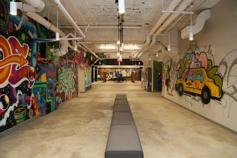 The third floor of the Equitable Building, used as an open space that serves as the building’s marketing center where prospective tenants are taken through on tours, was recently painted with a plethora of street art murals, including pieces by Lynne Yun, Michael Iver Jacobson, Pablo Ancona, Sam Meyerson, and Sebastien Dauchez. The New York City-based artists took inspiration from the city and from Lower Manhattan, and you’ll find visual references to New York City taxi cabs, to Broadway, and more. The space is also used for film and photo shoots. 120 Broadway is owned by Silverstein Properties, which also included street art activations at the World Trade Center.