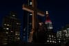 The interior scenes in the crypt appear to be a set but the exterior flyover shot, and the interior sanctuary are filmed at the church. The church cross, which Daredevil is holding on to, was likely attached to the apartment building behind for the shoot.