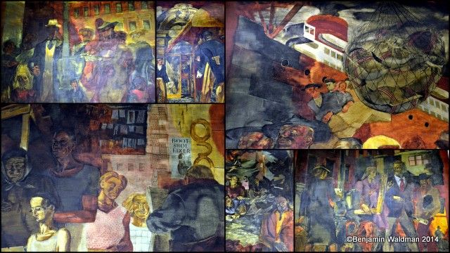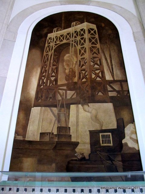 In the 1930s, Louis Lozowick, a Russian painter and art critic, painted two large oil painting in the lobby of the post office. Triborough Bridge and Lower Manhattan can still be viewed today, although the lower portion of Lower Manhattan has been covered by a memorial plaque (the lower portion can be seen on the original drawing). There are also remnants of a mural at the Annex to the Farley Post Office Building, which is unfortunately inaccessible to the public. This may change however, as the plans to convert the Farley Post Office into a train station and Amtrak waiting room got another jump start from Governor Cuomo yesterday.