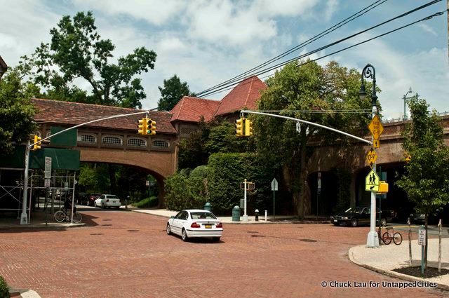 Early 1900s architecture and brick lined streets at the Long Island Railroad’s Forest Hills stop.