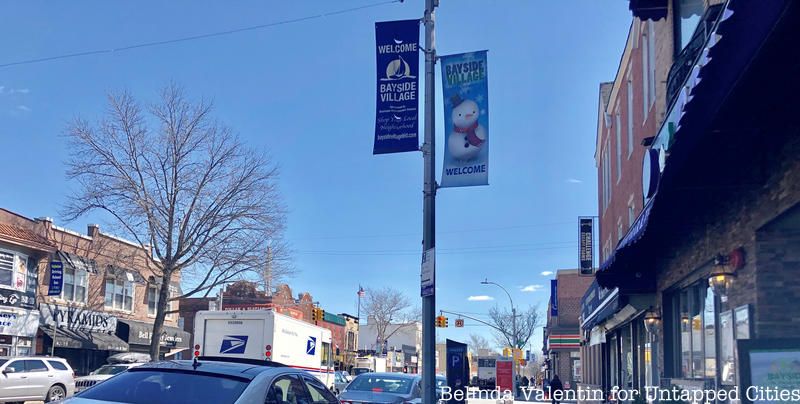 “Welcome to Bayside Village” signs along Bell Boulevard change with the seasons.