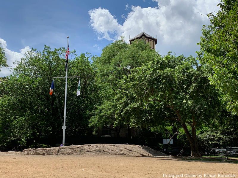 Bennett Park, named for newspaper man James Gordon Bennett who created the New York Herald and purchased the land in this area in 1835. Bennett Park was the site of Fort Washington and is the highest natural point in Manhattan at 265 feet above sea level. The stone marker that denotes this is embedded into the rock.