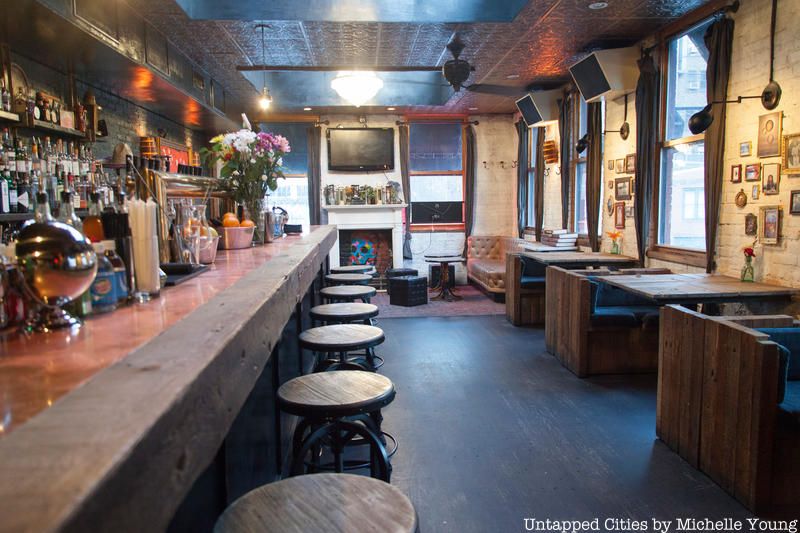 The Garret can be found at two locations in the city: one bar lies in the East Village on 206 Avenue A while the other is nestled in the West Village on 296 Bleecker Street. While the former is easily noticed on the street, the latter, The Garret West, is far more secretive and lies hidden on the second floor above a Five Guys. To enter, one must pass through the restaurant and head to the back where a secret staircase leads up to the large, loft-like bar space.