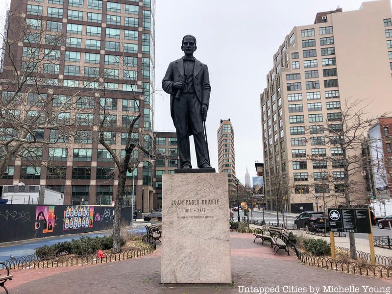 The statue of Juan Pablo Duarte can be found in the aptly named Duarte Square. Duarte, one of the founders of the Dominican Republic, was honored with a bronze statue designed by Nicola Arrighini in 1978. The Dominican Republic donated the thirteen foot statue of Duarte to New York City on the 165th anniversary of Duarte’s birth.
