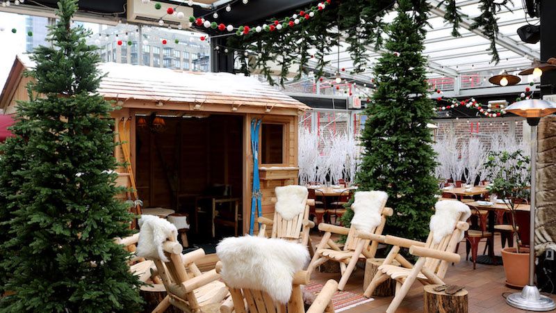 Another ski chalet, Haven Rooftop (132 West 47th Street), can be found sitting atop the Sanctuary Hotel in Times Square. The cozy, tented space is decorated with antler chandeliers, twinkling lights, and best yet — scheduled snow shows. As a refuge from the cold, guests can head to Haven for fondue, S’mores and a menu of hot cocktails, including the Toasted Almond (Kahlua, Vanilla Vodka, Amaretto and Milk), the Ginger Toddy (Torres, Bullet Bourbon, Cinnamon liquor, Fresh Ginger and Honey Syrup) and the Peppermint Cream (Baileys, Crème de Cacao, Crème de Menthe and Chocolate Liquor).