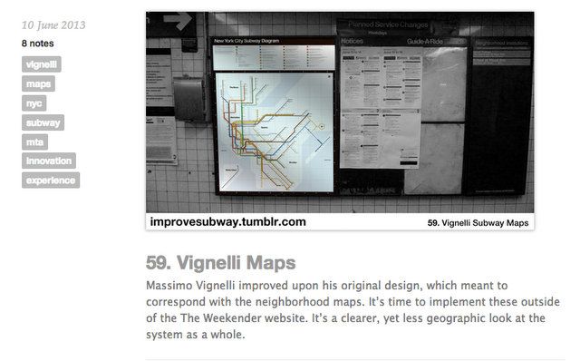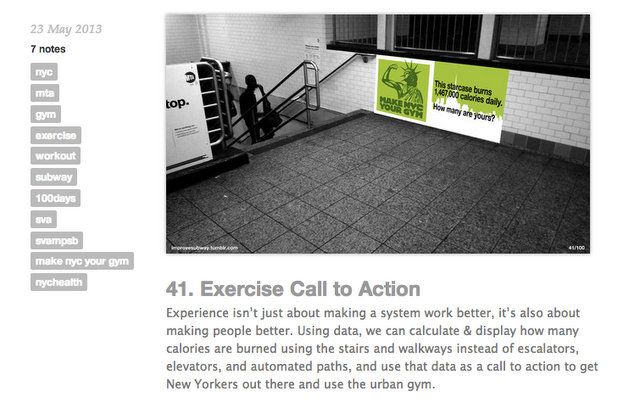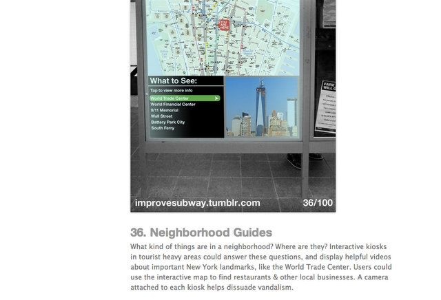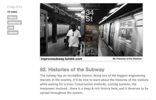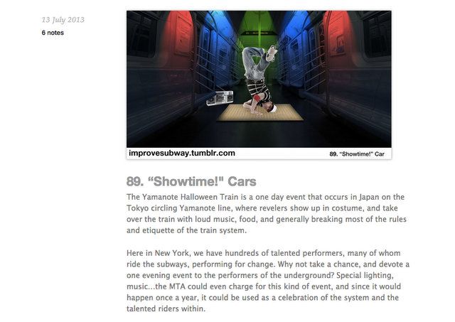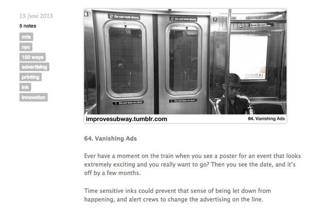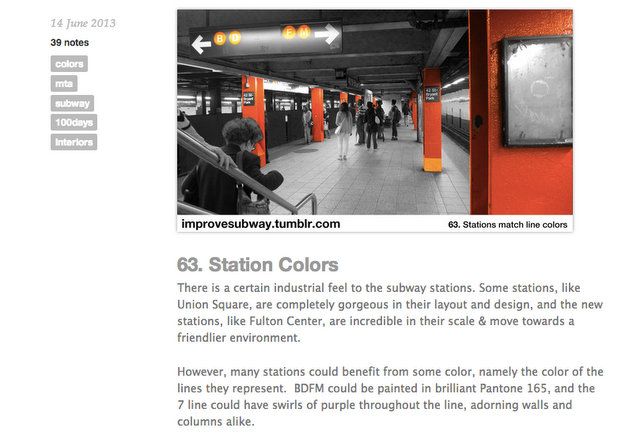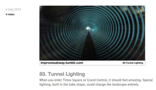 School of Visual Arts student Randy Gregory has been posting improvement ideas for the NYC subway almost daily on his Tumblr. New York Magazine reported on the more infrastructure-related suggestions, like a stair mesh to collect water in the stations, antimicrobial benches, indications of how cramped individual subway cars are, bike racks and safe inter-car passages. But as a branding major Gregory covered a range of topics, including suggestions about passenger behavior, fun ways to engage with riders and to improve the underground experience.