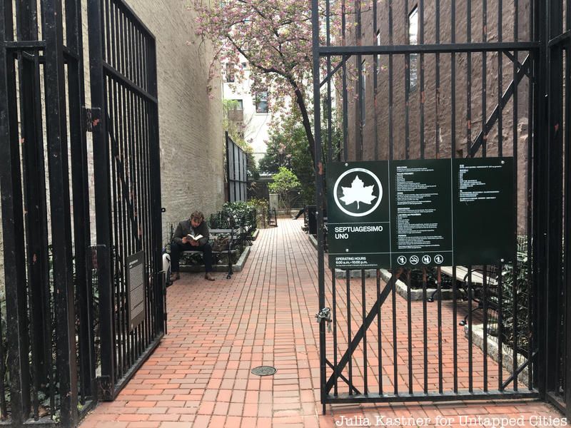 Septuagesimo Uno is one of Manhattan’s smallest parks (7th smallest, to be exact though it is often mistakenly cited as New York City’s smallest park. Located at 256 West 71st Street, its Latin name derives from the number 71. It’s secluded between two brownstones with some benches and received an upgrade in recent years with new brick paving, new trees, and benches.