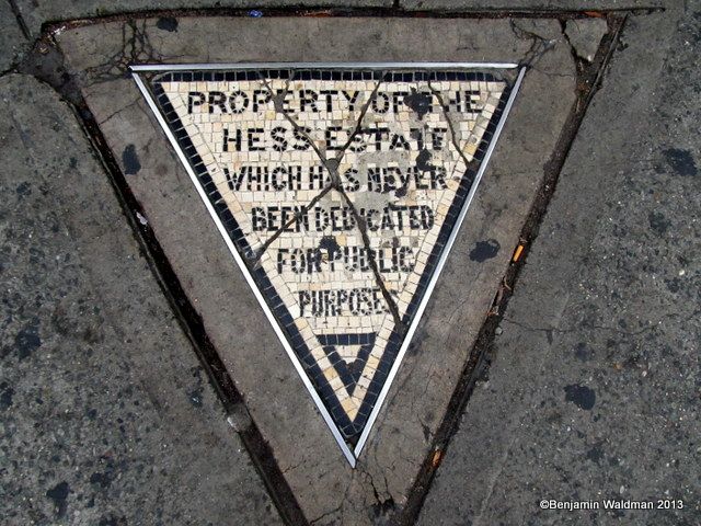 David Hess was the owner of the Voorhis apartment building on the corner of Christopher Street and 7th Avenue in Greenwich Village, and when that property was taken over by the city, he didn't give it up without a fight. Hess refused to relinquish ownership of a small plot of land measuring 500 square inches located on the plot of his former apartment building. On July 27, 1922, this slice of property was marked by a triangular mosaic of black and yellow tiles that reads "Property of the Hess Estate which has never been Dedicated for Public Purpose," obstinately declaring Hess's refusal to accept the City's request for the last vestige of his domain.