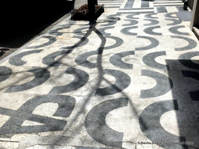 The funky sidewalk features three distinct patterns made up of curves, straight lined squares, and a sun-ray design made up of terrazzo. The tiles, which are made with marble chips and concrete, were created by the Foscato Bros. of Huntington, L. I., a company that employed elderly Italian Americans familiar with creating and working with terrazzo. Calder donated the design, but the construction costs came to $15,000 when it was complete in 1970.