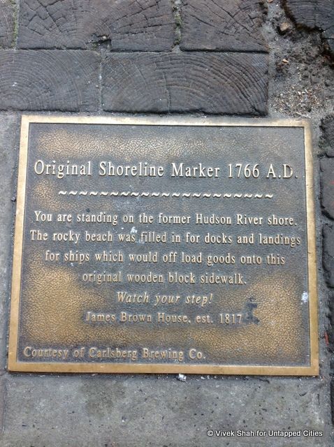 A plaque on the sidewalk commemorates the original shoreline of the river from 1766. This line wasn't crossed until 2012 when Hurricane Sandy brought the Hudson's waters almost a quarter mile inland, reaching almost to Hudson Street.