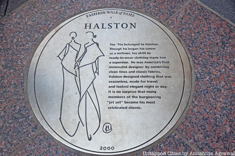 The metal plaques are 30 inches in diameter and framed with black granite. The plaques were installed over the course of three years and cost $200,000. Engraved on each piece is a sketch by the designer and a description of their contribution to the fashion world.