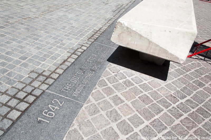 Part of the project included highlighting the former route of a canal that ran through downtown Manhattan in 1620 by marking its path with an engraved-granite curb that runs along Broad Street. The Heere Gracht, as the canal came to be named by Dutch settlers, flowed through New York when downtown Manhattan looked more like Amsterdam than the hub of modern finance that it is today. 17th-century NYC stretched only from the southern tip of the island up to a defense wall that ran along, can you guess where? Wall Street! You can still see wooden block pavers embedded in the cobblestone streets that indicate the site of the former wall.