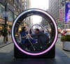 The Garment District Alliance has installed retro-futuristic cylinders on The Plaza. LOOP, a series of six cylinder modules — created by artists Olivier Girouard (Ekumen) and Jonathan Villeneuve (concept and execution), Ottoblix (animations), Generique Design (industrial design), Thomas Ouellet Fredericks (electronic design), Adsum Lab (technical support), Jérôme D. Roy (mechanical consultant), and Dominic Thibault (audio programming) — are seven-feet in length, three-feet wide, and nine-feet high. Pedestrians are invited to hop in and pump the movable lever to activate musical films.