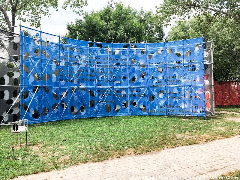 Socrate Sculpture Park in Queens is a great place to take in art and the views of Manhattan along the East River. A new large-scale work is in process by artist Rafael Domenech. Las Palabras son Muros [Pavilion for Astoria] (The Words are Walls [Pavilion for Astoria]) is made of scaffolding and construction mesh, with “pages” hanging that show graphically dynamic laser-cut texts that rotate throughout the exhibition.