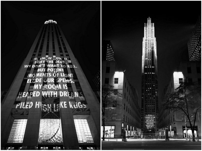 © 2005 Jenny Holzer, courtesy of Artists Rights Society (ARS), New York, presented by Creative Time. Text: “Necessary and Impossible” from MIDDLE EARTH by Henri Cole. Copyright ©2003 by Henri Cole. Used by/reprinted with the permission of Farrar, Straus and Giroux, LLC. Photo: Charliesamuels.comArtist Jenny Holzer, a long-time partner of Creative Time, will project texts highlighting gun violence and gun safety onto 30 Rock at Rockefeller Center starting at sundown October 10 to 12. This new work, VIGIL, will feature texts come from Bullets into Bells: Poets & Citizens Respond to Gun Violence, stories from Moments that Survive collected by Everytown for Gun Safety, and poems by teens who have grown up in the shadow of mass shootings.