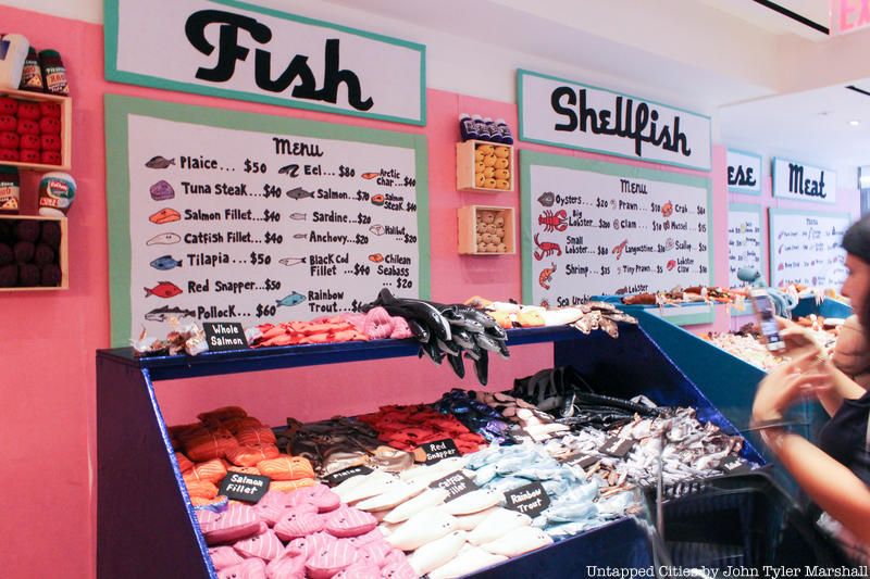 From October 1st to October 20th, a fake upscale deli made of felt will be at Rockefeller Center, made by the artist Lucy Sparrow who previously created a felt bodega at The Standard Hotel. Delicatessen on 6th will be on the corner of 49th Street and 6th Avenue next to Magnolia Bakery and really takes the concept to a whole new level. There is a seafood display with oysters, langoustines, lobsters, prawns, and crabs, “fresh” vegetables like tomatoes and onions, fruits, chocolate, patisseries, and French cheeses like Brie and Camembert.
