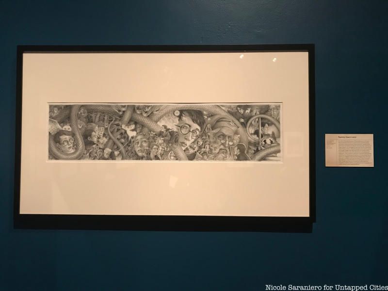 This piece is one example of the many pieces of original artwork created by the Harry Potter series’ many illustrators and cover artists that can be seen in the exhibit. There are cases filled with Harry Potter books from around the world, original sketches and drawings by illustrator Jim Kay, and examples of artwork by original cover artist Marie GrandPré, and Kazu Kibuishi, who designed the fifteenth anniversary cover art.