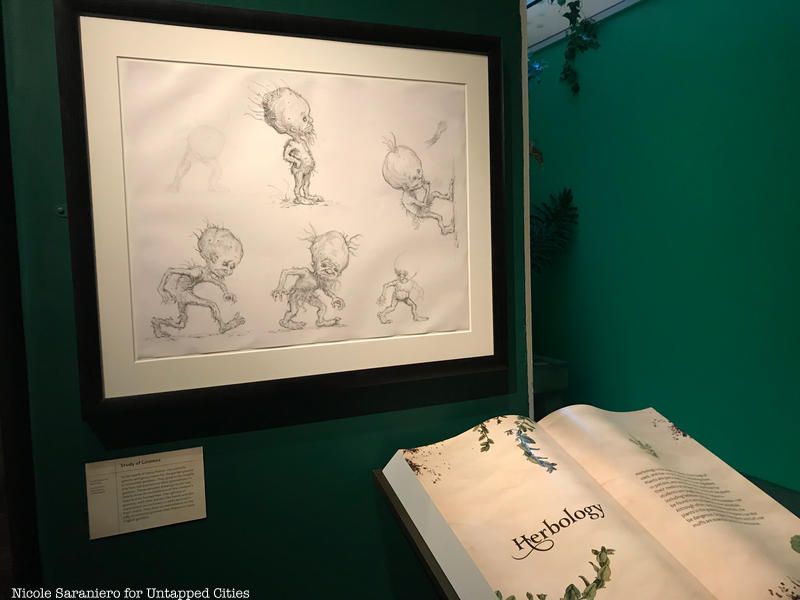 The root on display in this exhibition dates back to 16th or 17th century England and it looks like a bearded old man. Photo restrictions prohibited us from taking a picture of the mandrake, but above you can see original sketches of gnomes by illustrator Jim Kay.