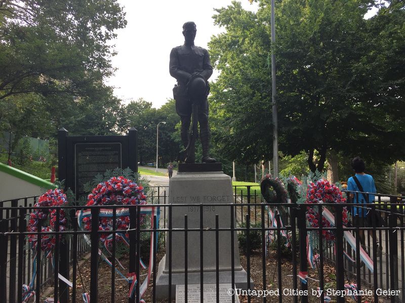 Even before the statue went up, soldiers from Woodside would gather here at the “mustering ground” before leaving to fight. Sadly, ten soldiers who left from the park never returned, In remembrance of these soldiers and others who died, the Woodside Community Council erected the statue. It was dedicated on Memorial Day in 1923, in a ceremony attended by many local residents, and in 1928, the American Federation of Arts selected the Woodside Doughboy as the best war memorial of its kind.