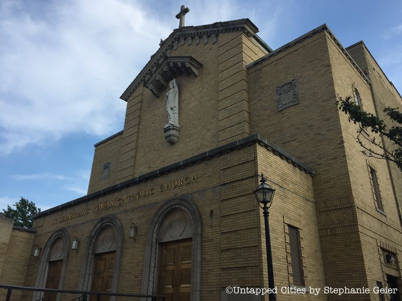 It might come as a surprise to Woodside residents and church-goers that St. Sebastian’s Church was once a Loew’s Theatre! The Loew’s Woodside theater opened on September 27, 1926, and was designed by Herbert J. Krapp. The theater’s huge capacity—over 2,000 people—is still reflected in the vastness of the church’s interior today. The theater’s opening night featured a pre-release of Buster Keaton’s comedy film, the Battling Butler.