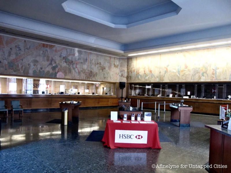 The mural, which is painted on canvas, depicts what 14th Street and 6th Avenue might have look during the late 1800s: women are depicted carrying parasols; there are horse-drawn carriages and commuters are seen running to an elevated train. Before it was gutted, the building (101 W. 14th St.), designed by Halsey, McCormack & Helmer and constructed in 1953, formerly housed a HSBC branch. Binford, however, painted the mural for what was then known as the Greenwich Savings Bank.