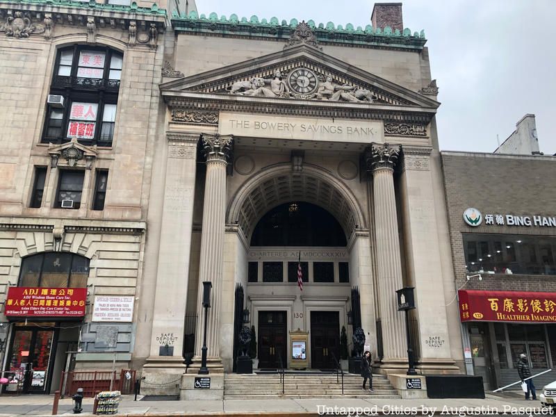 The headquarters of the Bowery Savings Bank at 130 Bowery is heralded by the Landmarks Preservation Commission as one of the first examples of “new classicism,” a style established at The World’s Columbian Exposition, at Chicago in 1893 and that it “is a fine, dignified expression of a New York banking house and that in its skillful use of site, its good proportions, fine detail and sculpture, it reflects credit on the well-known architectural firm which designed it.” The building sits on an L-shaped lot and was designated a landmark in 1966.