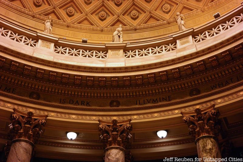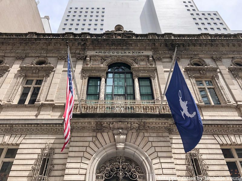To purchase the land on which the clubhouse stands each of the twenty-five founding members contributed $5,000. The land was at the foot of “Millionaire’s Row,” the fashionable uptown district characterized by the Gilded-Age estates of the wealthy upper class. The Italian Renaissance styled white marble clubhouse, which was designated as a landmark in 1979, cost nearly $2 million to build, which amounts to just over $48 million today. While the exterior design of the building showed restraint in design, the inside boasted extravagance. No expense was spared for the club’s amenities which include a dining hall, a breakfast room, smoking room, a reading room, two card rooms, three large private dining rooms, 22 suites for overnight guests, a bowling alley, wine rooms, a roof garden and even a ladies’ annex. The inside is covered in gilded flourishes, marble, coffered and mural covered ceilings, stain glass windows, and wrought iron railings that run along the fifteen foot wide grand staircase.