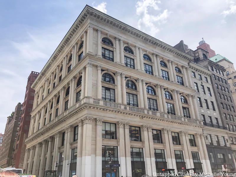 In 1903 then president of Tiffany and Company Charles T. Cook reportedly asked the firm of McKim, Mead and White to “build [him] a palace.” The interpretation of that request was 401 Fifth Avenue, a seven story white marble structure based on the sixteenth-century Palazzo Grimani in Venice. The building appears to only have three stories thanks to the three horizontal divisions that frame rows of two story windows Corinthian columns.