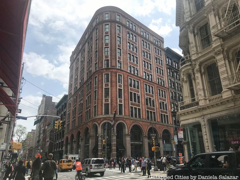 The structure is seemingly sleek compared to some of White’s other more ornate designs. Constructed in the Chicago School style, the facade is a mix of different shades of brick and cream colored terra cotta arranged in sawtooth, basket weave, and linear patterns. The structure rises ten stories high. After the death of the Goelet brothers, their heirs sold the building to a developer who made some renovations and continued to use it as a commercial space. By the 1970s the building and the surrounding area had become dilapidated. The structure was purchased by real estate investor Zoltan Justin who, with the help of his son Jeffery, undertook a major restoration project that cleaned the facade, removed roll-down gates that covered the rounded corner storefront, took out cinderblock infill from between the arches and completely redid the lobby.