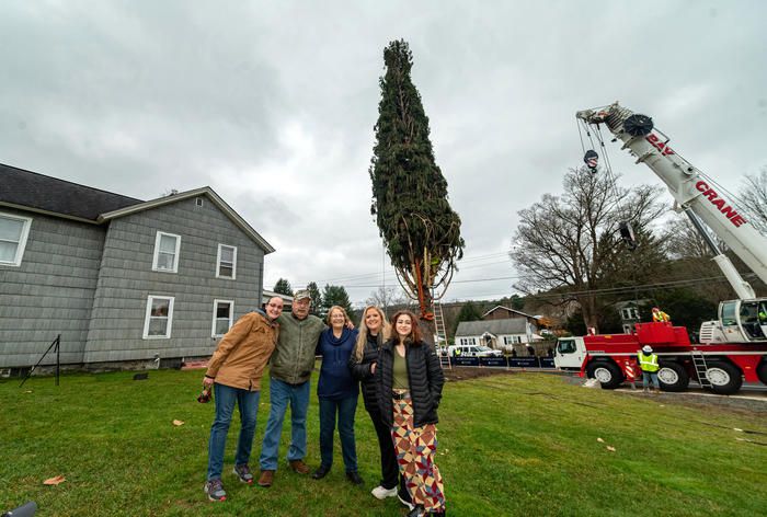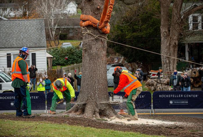 Daddy Al’s General Store donated this year’s tree. Owner Al Dick, his wife Susan, their daughter Paula and two granddaughters Autumn and Jade were all in attendance at the tree-cutting ceremony to watch the 75 to 80-year-old tree come down. Before the tree is cut, workers secure it to a crane and tuck in and tie down its branches. Unfurled, the tree has a 45-foot wide diameter. Once secured, the crew cuts through the trunk with a chainsaw. It only takes about a minute to slice all the way through. The giant crane then lifts the 11-ton tree away from its stump and hoists it onto a 115-foot long trailer for the drive to Manhattan.