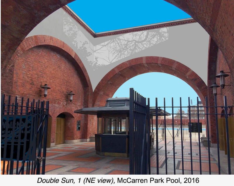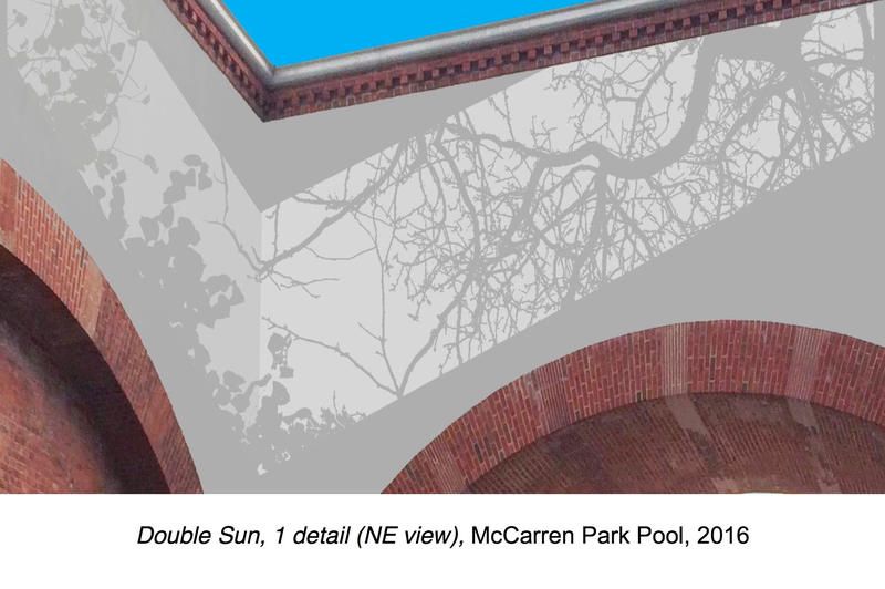 The McCarren Park Pool Bathhouse unveils its Percent for Art Artwork Installation, Double Sun, with the opening of the pool this summer. Artist, Mary Temple began work on this project immediately after the 2016 swimming season, during evening hours over approximately fourteen evenings. The two highly visible troupe l’oeil illusions were hand-painted using hand-mixed latex paints, tinted lighter than the base color. The tree-branch murals that make up the installation, Double Sun, will welcome visitors as they move beneath the archways.