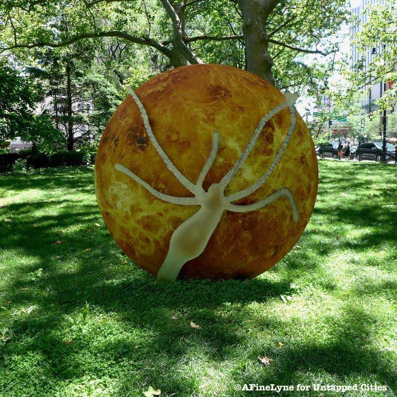 City Hall Park will be invaded by seven large, flat cut aluminum sculptures entitled Earth Potential. As part of the 40th anniversary celebration of the Public Art Fund, Earth Potential by artist Katja Novitskova, was created using digitally printed imagery of terrestrial animals and organisms over celestial bodies and planets. Focusing on human advancement, Novitskova imagines worlds unseen by the naked eye. City Hall Park is located at 43 Park Row. The exhibit, Earth Potential, will be on view from June 22 to November 9, 2017. Be sure to check out last month’s Public Art Fund installation, Anish Kapoor’s Decension at Brooklyn Bridge Park.