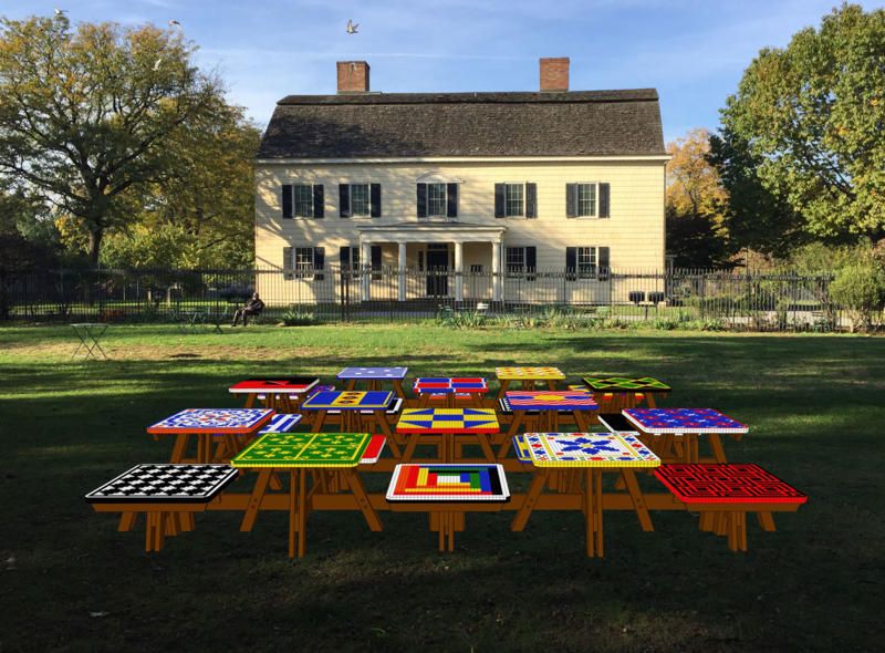 The artist, Risa Puno, has created a way to literally bring people together with her installation, Common Ground. The colorful, adjacent tabletops celebrate the diverse community that shares Rufus King Park in Queens in front of the King Manor Museum. With this installation, Puno focuses on harmony through diversity in a park that once was the home to statesman and lawyer, Rufus King – son of a wealthy lumber merchant.