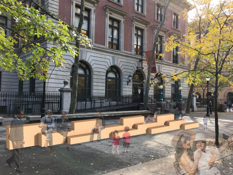 Circadia, by artist Blythe Cain, will grace the entrance to Fort Greene Park. It was created with materials referencing historic building foundations, and formed with shapes resembling the natural landscape of the park. The luminescent sculpture includes a seating system made from concrete and recycled phosphoric glow-in-the-dark tiles.