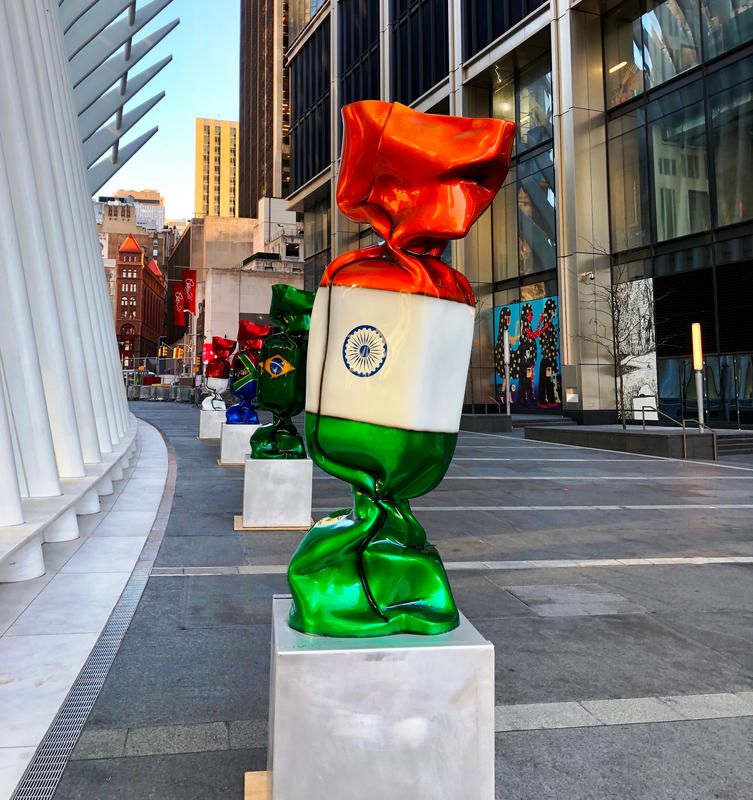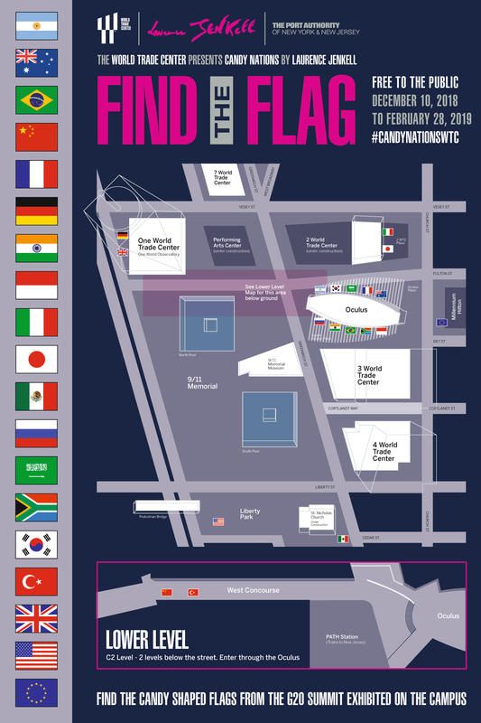 Artist Laurence Jenkell’s Candy Nations sculptures have popped in other New York City locations before and this winter make their latest appearance outside the World Trade Center Oculus. Jenkell’s series is made up of oversized candy shaped sculptures emblazoned with the flags of different countries from around the world. The piece was first created for the G20 Summit in Cannes, France in 2011. The sculptures can be found surrounding and inside the Oculus, in front of One and Two World Trade Center, the Millenium Hilton, and St. Nicholas’ Church and inside Liberty Park. To find a certain country, you can reference the map below. The sculptures will be on display until February 28th, 2019.