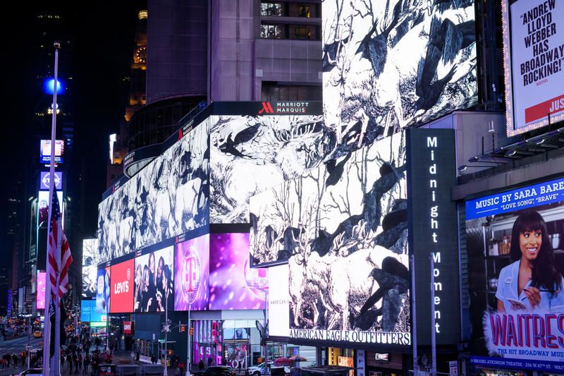 At midnight on every night in January the work of French visual artist and director Vergine Keaton will grace the mega-screens of Times Square. Times Square Alliance’s January Midnight Moment will feature Keaton’s I was crying out at life (2009), an animation that “inverts classical hunting and landscape scenes from 19th-century engravings to tell a tale of stags chasing hounds.” Keaton says of the piece, “Times Square is the ultra-urban, the very incarnation of remoteness from natural life. That the deer, dogs, and birds will pelt down in their furious race across the screens of the city, towering over the audience, seems to me to add yet another dimension to the film—bringing nature where it once was and showing its timelessness against the scale of human construction.” I was crying out at life is presented in partnership with the French Institute Alliance Française (FIAF) during the Animation First festival.