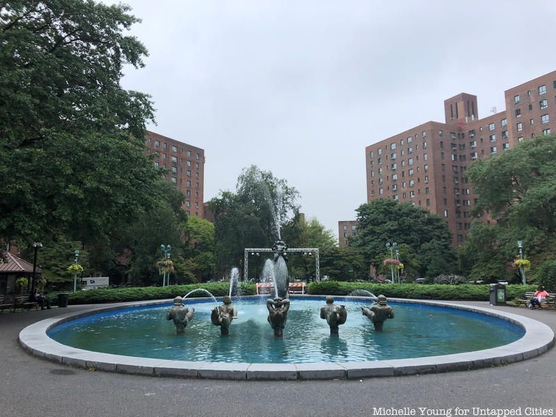 Parkchester (a portmanteau of the two neighboring neighborhoods Park Versailles and Westchester Heights) was created by the Metropolitan Life Insurance Company in the early 1940’s as a self-contained middle class Community. It contained a movie theater, stores, schools, and an beautiful public art scheme. In the center of the community is the Parkchester fountain which consists of delightful spouting Moderne figures.