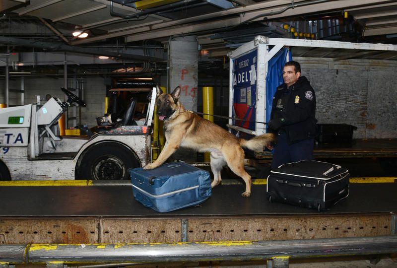 The dogs of homeland security at John F. Kennedy International Airport work hard and play hard too. They are trained to sniff out contraband in luggage and on people and signal their human partners when they make a find. The dogs do their job so discreetly you may not even notice that their noses are on alert as they walk by. Dogs like the Malinois pictured above screen pieces of luggage that are coming and going in and out of the country. The most common find is some type of agricultural product, like a snack, that unintentionally poses a risks due to the contaminants it may carry. Every time a find is made, the dogs are rewarded with playtime. Often there are decoys planted in lines of boarding passengers and on luggage conveyor belts so everyday the dogs can count a success.