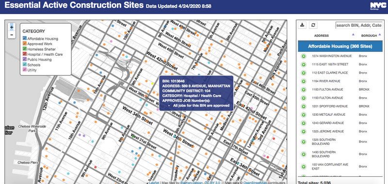 While currently all non-essential construction is put on hold, we can be certain it will be one of the first industries to bounce back when the pandemic lets up. A service of New York’s Department of Buildings, the curious can probe the nitty-gritty details behind the construction projects shaping our city in a real-time NYC Essential Active Construction map. A spokesperson for the Department of Buildings tells us “The vast majority of the over 35,000 construction sites in the City were shut down on March 30th due to the Governor’s Executive Order. This map shows the sites that were deemed essential and are allowed to remain open.”
