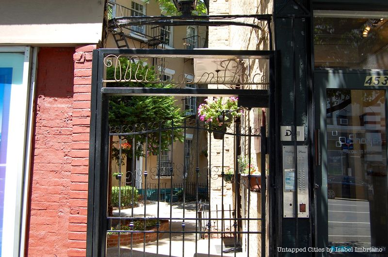 Grove Street is perhaps one of the more idyllic streets in the West Village, if not NYC. Beginning at Christopher Street Grove Street continues West making a slight curve before ending on Hudson Street. Along the street, there is a tiny gate with a black sign with gold lettering that states “PRIVATE COURT, No Trespassing.” This gate leads to the hidden Grove Court, a small court yard with 19th century townhouses. Samuel Cocks created the alley in 1848 to house tradesmen and other workers, and, due to the cheap alcohol made there, it was dubbed “Mixed Ale Alley.”