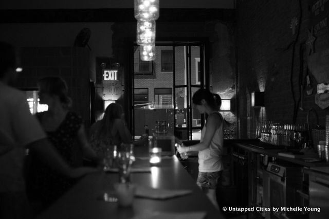 I discovered 61 Local through the LocalRootsNYC Supper Club. 61 Local describes itself as a public house with locally crafted food but it’s a lot more than that. Owner Dave Liatti designed the space, which was a former townhouse and garage in Cobble Hill, Brooklyn. Original elements were retained as much as possible, including an old fireplace and the exposed brick walls. The space is designed, but not overly controlled, Liatti says.  He told me that he was inspired by a need to bridge the disconnect between the thoughtfulness and creativity that goes into food and drink and the environment in which they are consumed.  To that end, the place is open and breezy, with lofty ceilings, wooden furniture and whimsical details. The lamps above the bar are made from repurposed Carboys, used for home brewing.