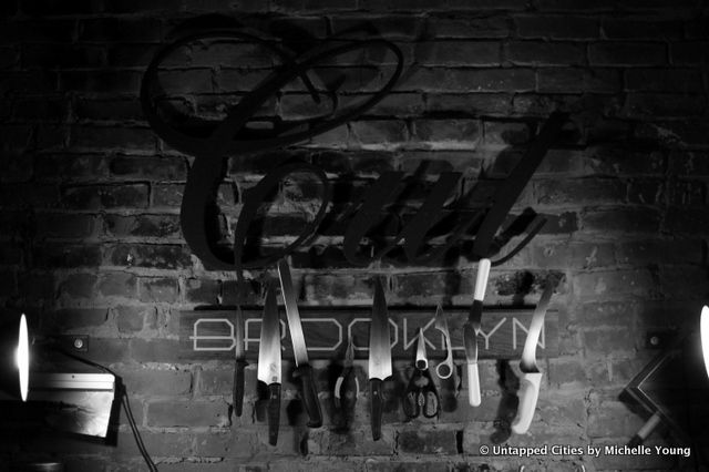 Liatti also designed the knife rack, featuring knives from Cut Brooklyn–beautiful local, hand-made cutlery. He took the time to point out the logo on the knife, the wooden handle and the design of the metal rivets.