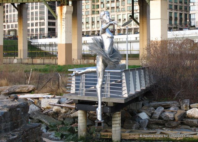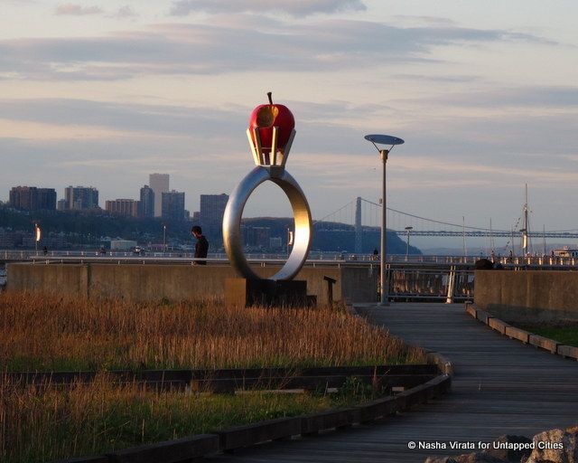 Anne Stanner‘s “Wave” provides a commentary of the river’s ecology, with fish swimming and leaping among “curved triangles” of a stainless steel wave. Stanner was inspired to create the “Wave” after hearing about a highway project, scrapped in the 1980s to protect the river’s seabass population.