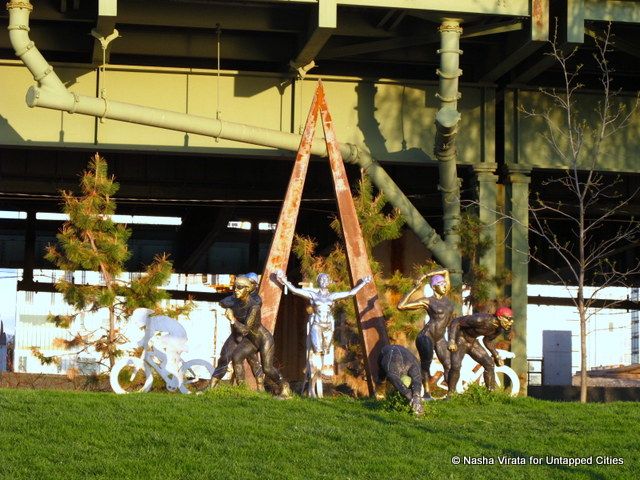 Sherwin Banfield created “Transitions through Triathlon,” inspired by the “cultural carnival aesthetics” of the Caribbean. Banfield moved to America when he was ten years old from his birthplace of Trinidad & Tobago. The sculpture celebrates the artist’s vibrant cultural background and his experience as an active Triathlete.