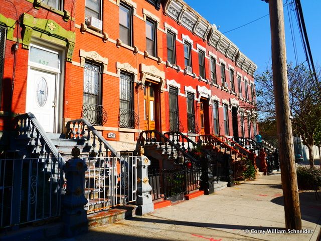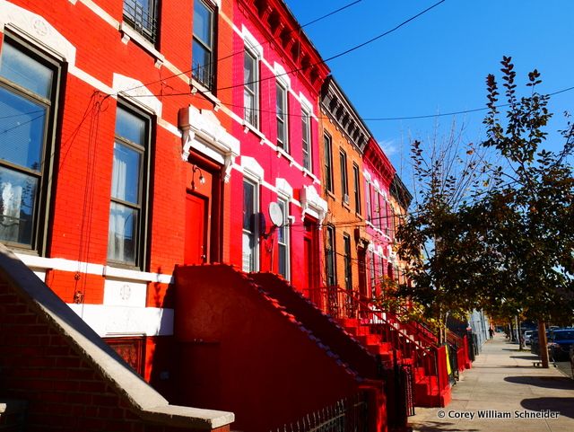 Located on the south side of East 142nd between Willis and Brooks Avenues, these 42 neo-Grec rowhouses designed by William O’Gorman date back to 1897. While they were originally built of brick with stone ornaments, many are now an array of bright and bold colors.