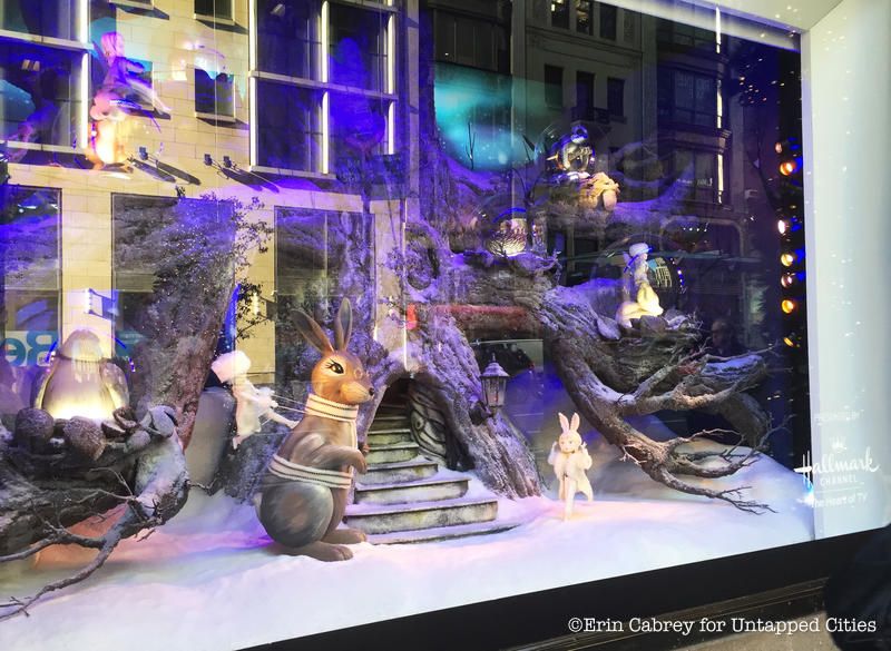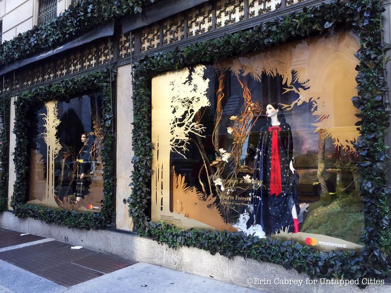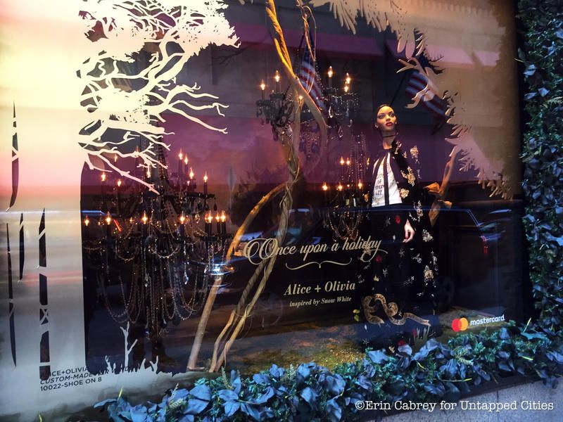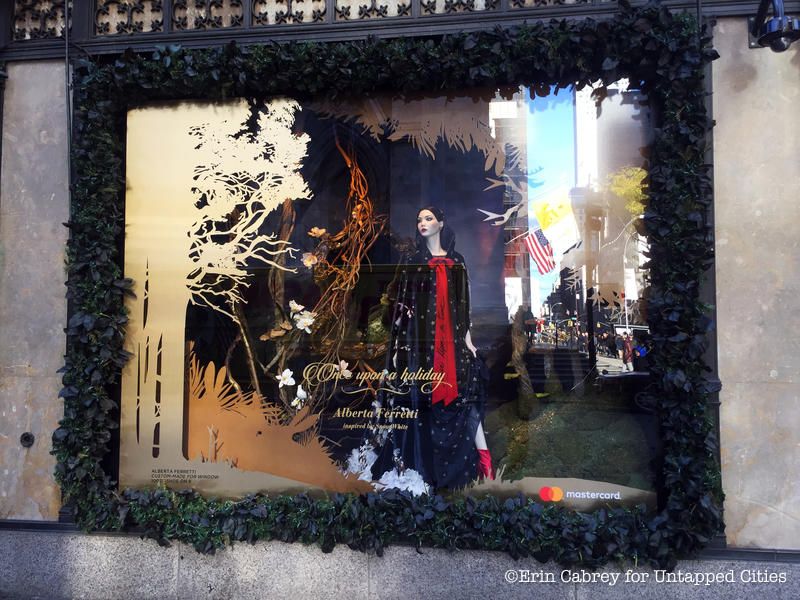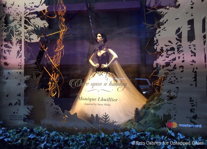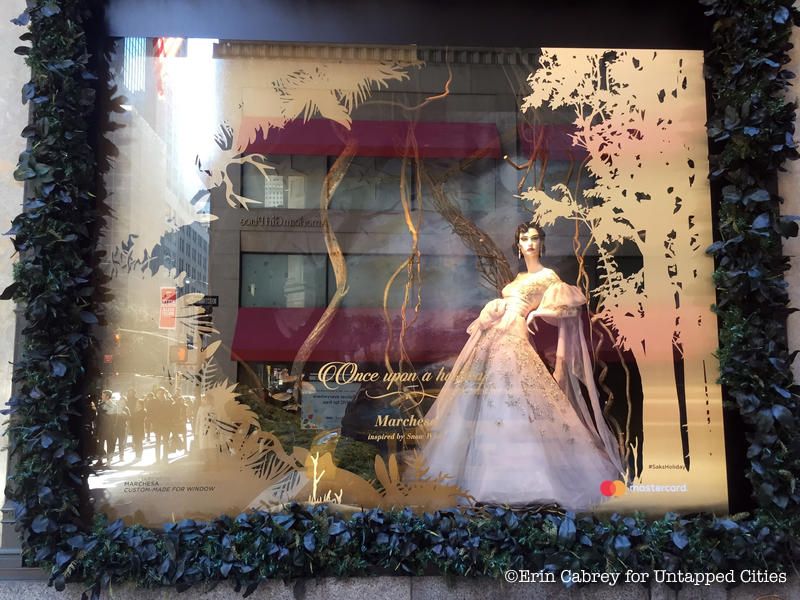 The windows at Saks Fifth Avenue are not only inspired by the holidays, but also by Disney’s Snow White and the Seven Dwarfs. Entitled “Once Upon a Holiday,” the display celebrates the 80th year of the movie and features different scenes from it, including Snow White dancing with her furry woodland friends.