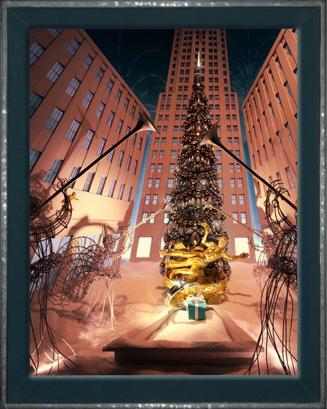 Illustrating the magic of giving a Tiffany present, the windows shimmer with light and focus on the famed Tiffany Blue Box. Designed by Gene Moore, one scene includes an engagement ring set on a hook and a mannequin ice fishing while another showcases figures sculpting ice. There’s also a Christmas tree decorated with diamonds and a mini Rockefeller Center, presented with a jewel-trimmed tree and Prometheus in gold leaf (images via Tiffany & Co.). The windows are on view through January 1.