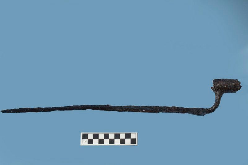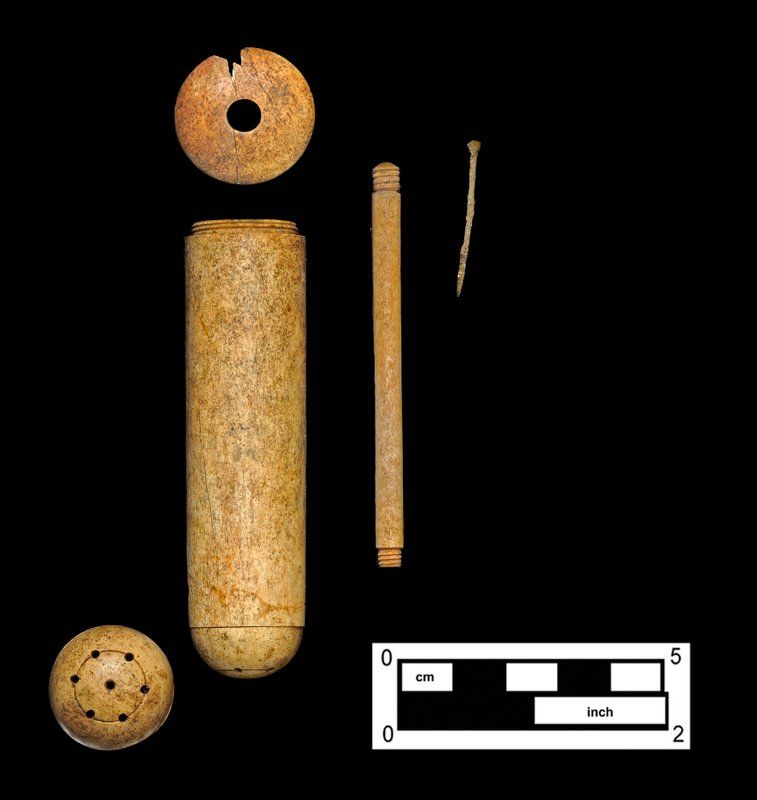 This hollow, cylindrical object made of mammal bone was initially thought to be a spice grinder or needle case. It dates back to somewhere between 1803 to 1815, found in a garbage pile three feet underground on the north side of City Hall. Archaeologists believe all the items in this pile may come from one “celebratory event.” According to archaeologist Lisa Geiger, women across social classes gave them as wedding presents to each other, though the use and effects were somewhat misguided.